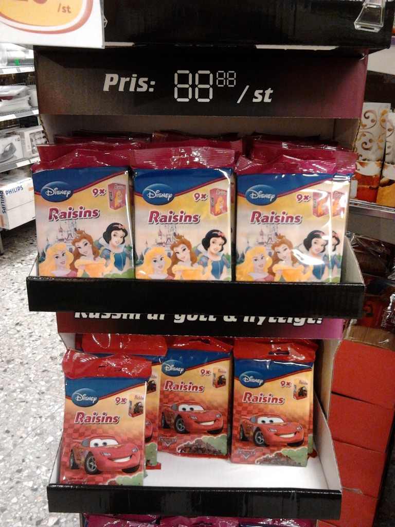Det här är snudd på det dummaste jag sett. Det är russin, ett paket kostar 27 (!!!!!) kr och det är pyttelite i ett paket. Givetvis tjatar sig Victor blå om att han vill ha Blixten McQueen-godis. Mmm.. en annan gång kanske. För den summan får väldigt mycket russin i vanliga paket.