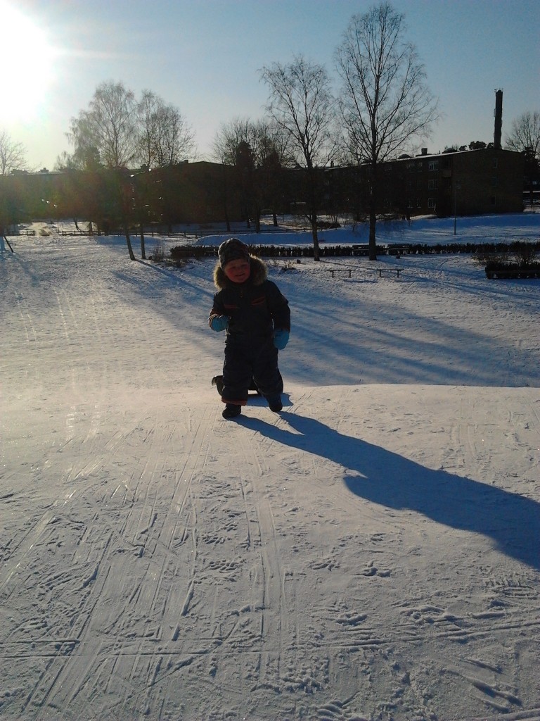 Efter dagis ville Victor ut och åka pulka för han har inte varit ute idag. Lovisa däremot tyckte att mellanmål var superviktigt. Vi kompromissade så Lovisa fick lite välling, men eftersom hon ville krångla så mycket som möjligt tog hon av sig alla kläder för att bädda ner sig. Turligt nog var hon mer samarbetsvillig när allt skulle på igen och vi njöt i lekparken/pulkabacken av en solig vintereftermiddag. Inte tokigt alls.