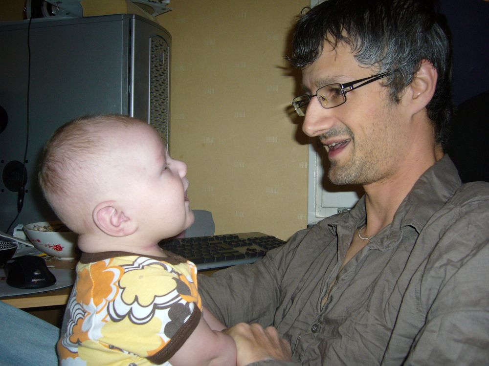 Kvällen när den här bilden togs skulle vi egentligen varit på Lovisas dåvarande dagis, det var familjekväll med fika, lekar och ponnyridning. Vi försov oss lite för alla var trötta, när vi väl vaknade regnade det ute. Vi bestämde oss för att stanna hemma, under kvällen tyckte jag att Victor blev väldigt blå mellan varven och hade saturationsmätaren påkopplad länge och väl. Han gick ner mycket i syresättning, men lyckades ständigt återhämta sig. På bilden hade han precis lyckats lära sig att sitta lite och kommit igång med skratt, han skrattade sitt lite smånördiga he-he-he och jag var tvungen att ta en bild.