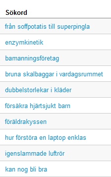 Det är liksom inte så värst livat hos oss på lördagarna, på sin höjd ett glas vin. Idag inte ens det. Något som dock kan få mig att flabba rejält är att kolla in google analytics och se vad folk har googlat på för att komma till min sida. En del saker är så himla roliga.